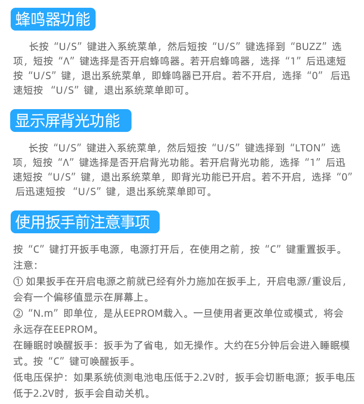 - 蜂鸣器设定范围(N.m)):0.3~10